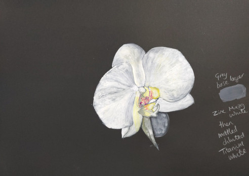 I used my sketchbook and loose leaves to think about the rules of aerial perspective. Then, I used YouTube and various drawing books to contemplate and consider changing my composition for the required result. Finally, I researched how to paint orchids and which colours made aerial perspective work.