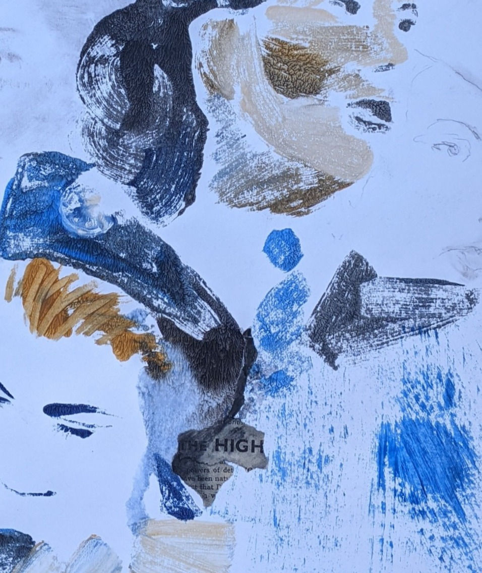 I have further developed a personal voice through my experiences and practice. I have the imagination to invent and communicate these feeling into my processes. I have used digital cutting machines, digital filters, mixed media and collage to enhance the monotype technique. Following artist research I have correlated first hand artworks in exhibitions to understand and apply creativity with my work. I have taken risks and pushed myself with mark making, creating unfinished areas and erasure of mediums in my work.